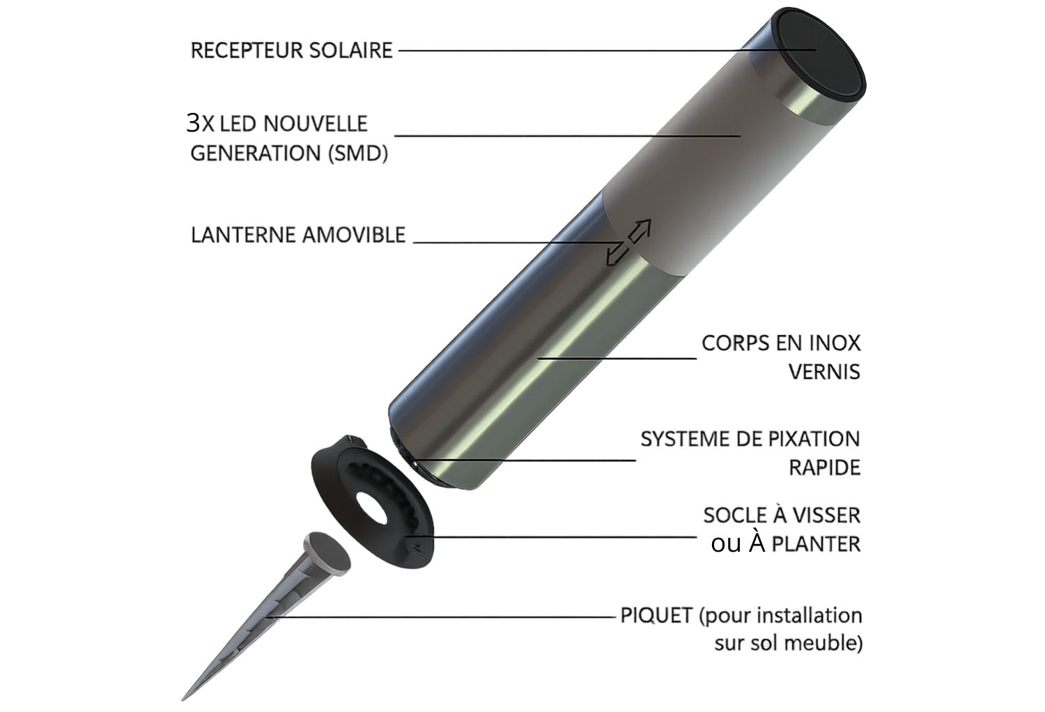 Le principe repose sur un socle (fourni) que vous vissez ou plantez à l'emplacement souhaité. Il suffit ensuite d'y clipser la borne solaire, et le tour est joué. Ce procédé exclusif offre trois avantages majeurs :