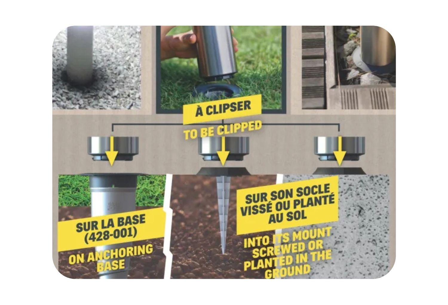 ☛ ASTUCE : Les bornes solaires peuvent également se clipser directement sur les bases d'ancrage Gard&Rock (réf. 428-001). Si vous en possédez déjà — pour maintenir un parasol, par exemple — il vous suffit de les réutiliser pour y fixer vos bornes en soirée ou durant la saison hivernale. Un seul ancrage, plusieurs usages.